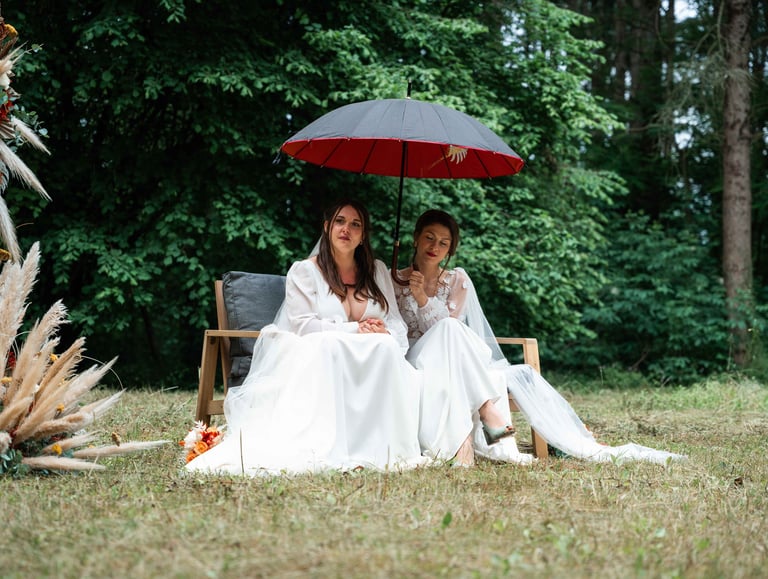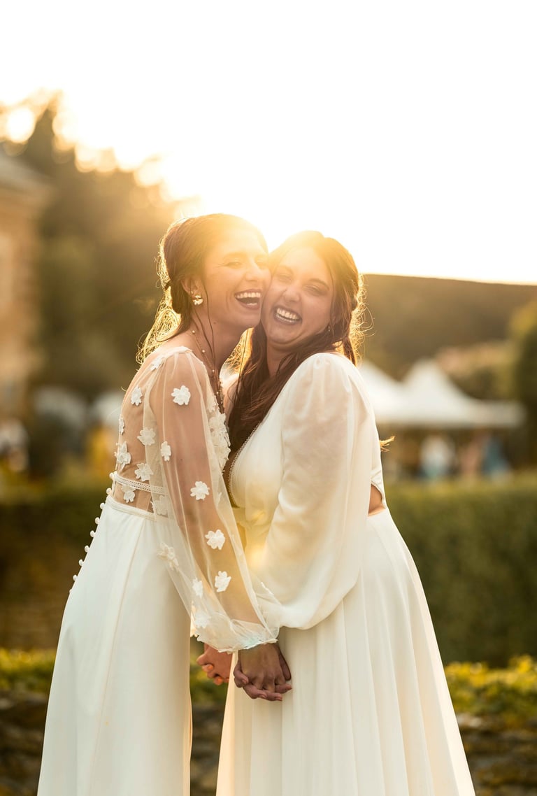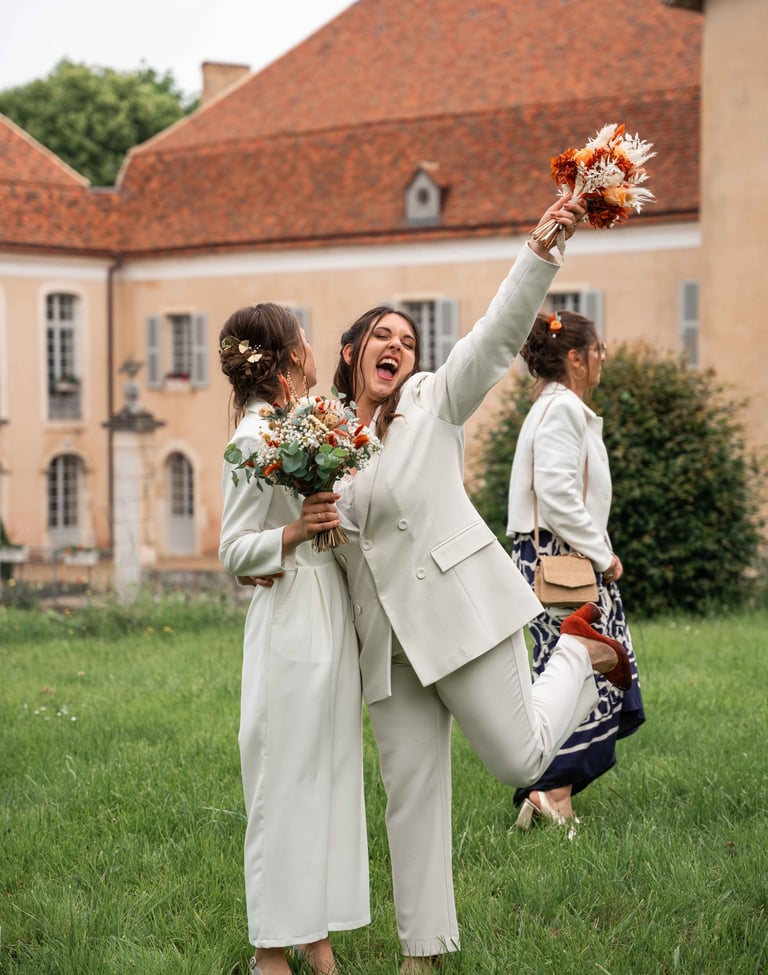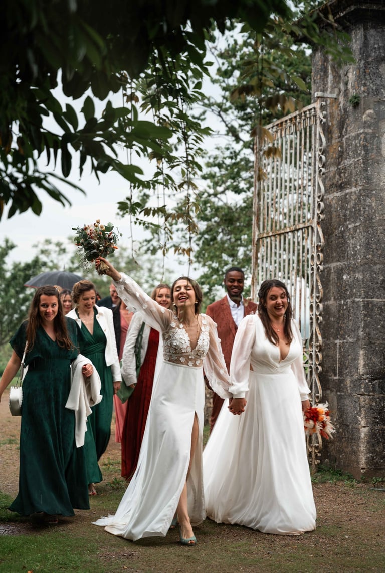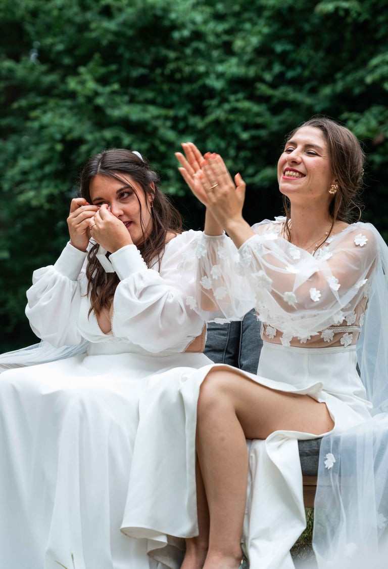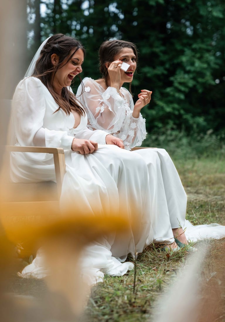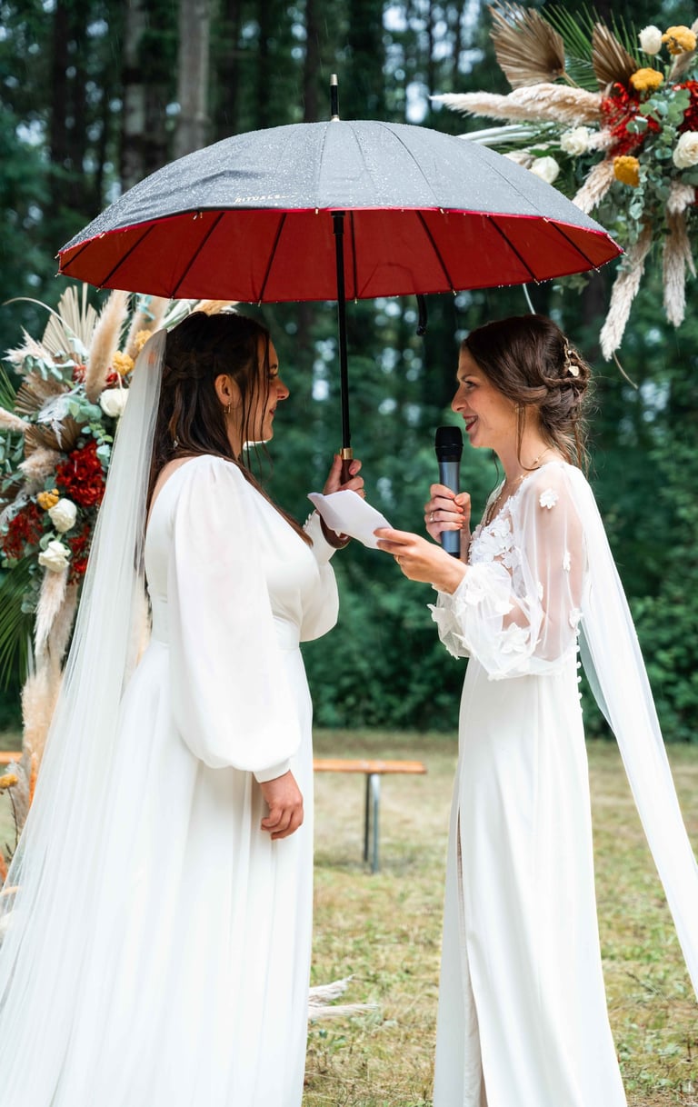Concernant Amandine et Elsa, de bonnes fêtardes bons délires, nous avons rarement vu des mariées aussi peu stressées, surtout au vu du temps et de la pluie qui est tombée en pleine cérémonie laïque !