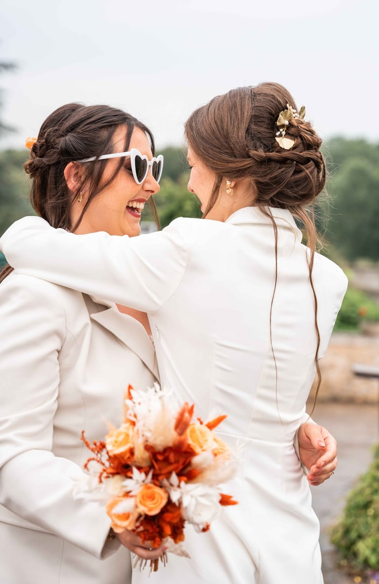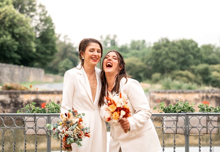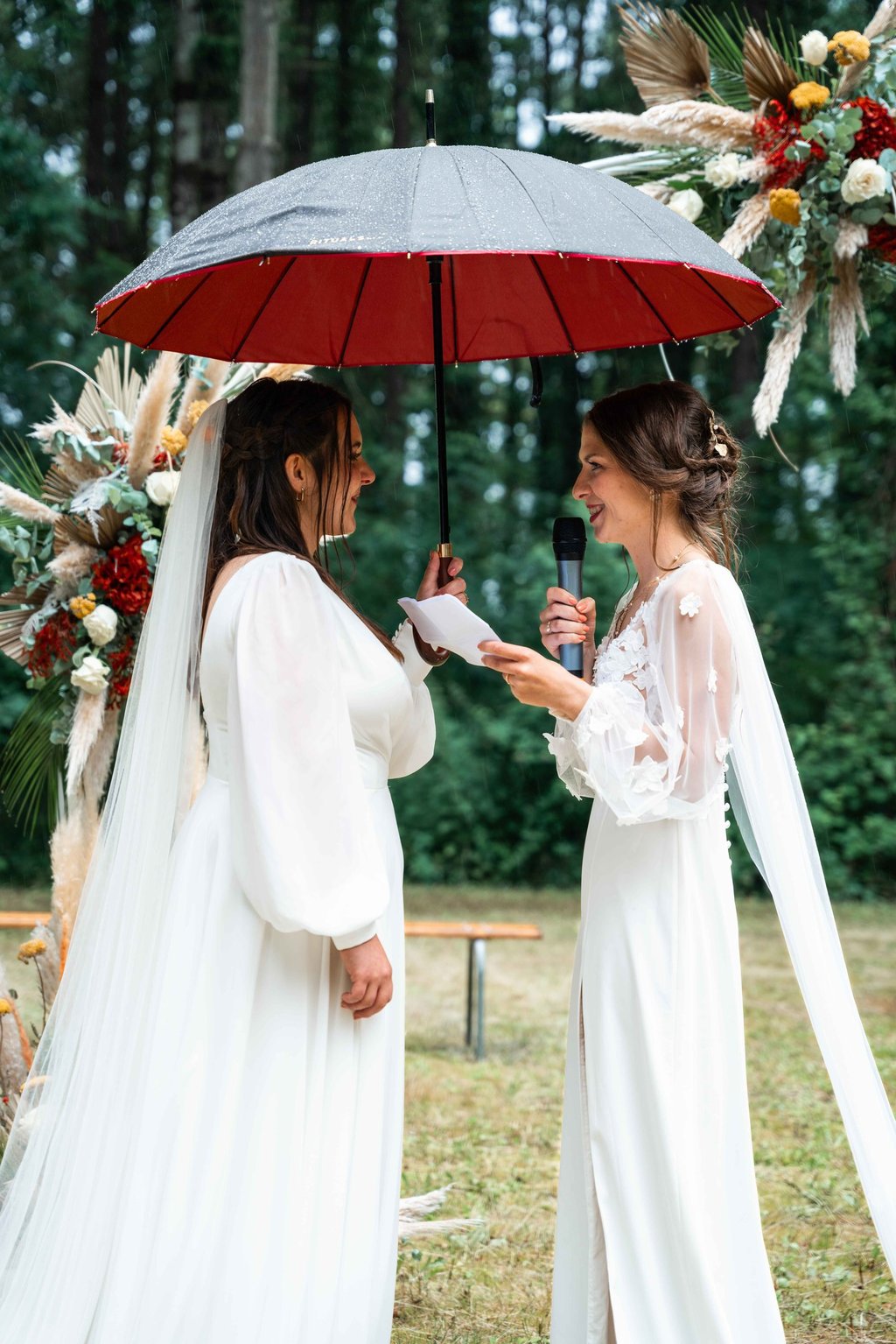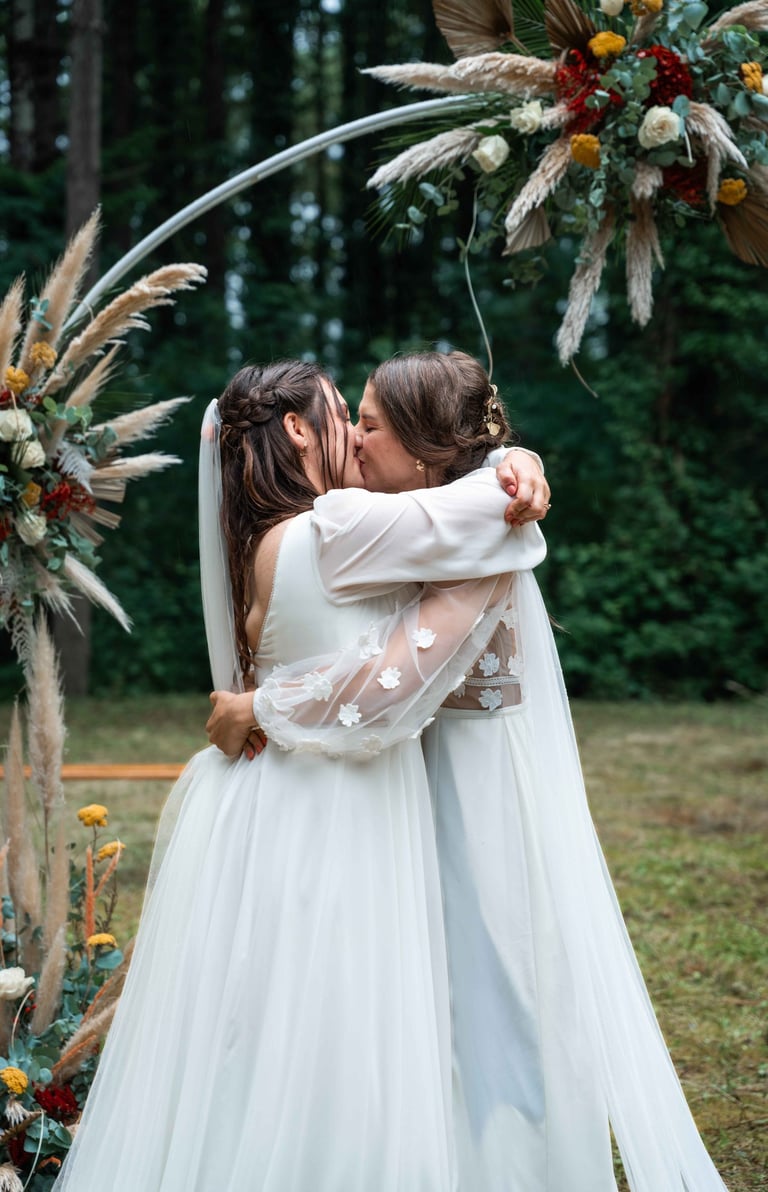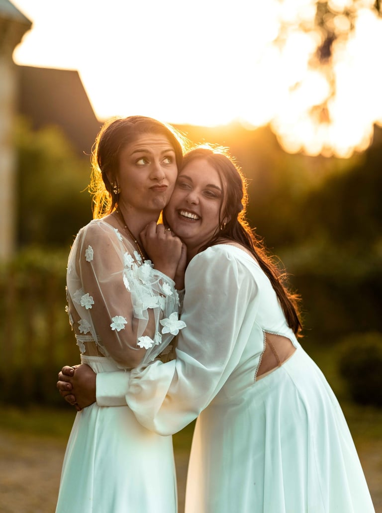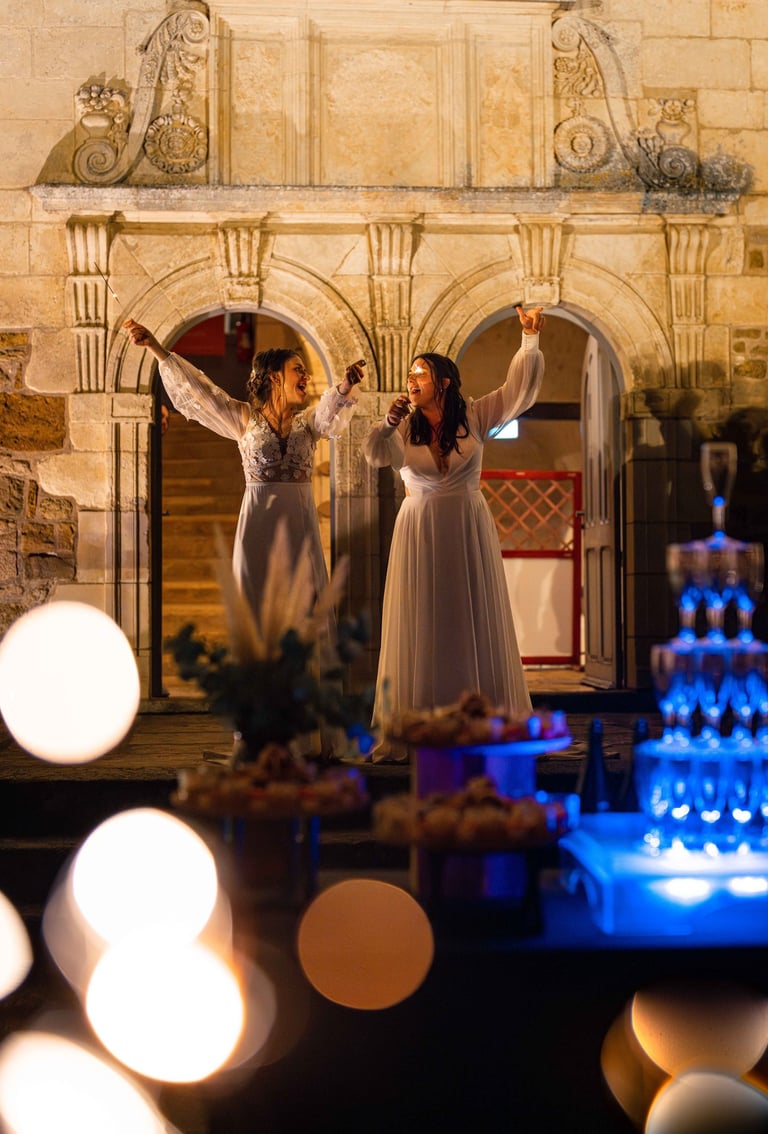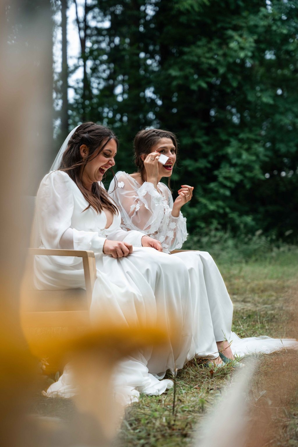 Concernant Amandine et Elsa, de bonnes fêtardes bons délires, nous avons rarement vu des mariées aussi peu stressées, surtout au vu du temps et de la pluie qui est tombée en pleine cérémonie laïque !